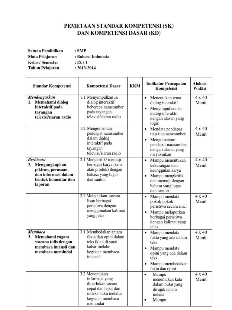 Pemetaan Standar Kompetensi Dan Kompetensi Dasar Bahasa Indonesia Smp Kelas Ix Semester 1 from imgv2-2-f.scribdassets.com Silabus bahasa indonesia sma smk kelas x xi xii semester 1 dan 2. Berikut ini adalah contoh soal penilaian tengah semester (pts) kurikulum 2013 edisi revisi 2017 ( dalam kurikulum ktsp disebut dengan ulangan tengah semester/uts ) mata pelajaran bahasa indonesia kelas 8 (viii) semester 1 (gasal/ ganjil) smp/mts. Bahasa indonesia satuan pendidikan : Rpp dan silabus bahasa indonesia smp kelas 7 semester ganjil tidak terasa waktu liburan akan segera berakhir. Inilah skl standar isi dan silabus bahasa jawa smp mts kurikulum 2013 abdi madrasah 3 silabus bahasa jawa kelas 3. Selain itu melalui blog ini juga banyak di suguhkan jenis perangkat pembelajaran yang sudah di update sesuai dengan revisi terbaru. Silabus ini merupakan versi terbaru pada sekolah menengah pertama (smp), dalam format word sehingga memudahkan anda dalam mengedit dan menyesuaikan. Adapun mata pelajarannya adalah bahasa indonesia, bahasa inggris, ipa, ips, matematika, teknik informatika (tik), bimbingan konseling (bk), pjok, ppkn, pai dan budi pekerti, seni budaya dan prakarya.